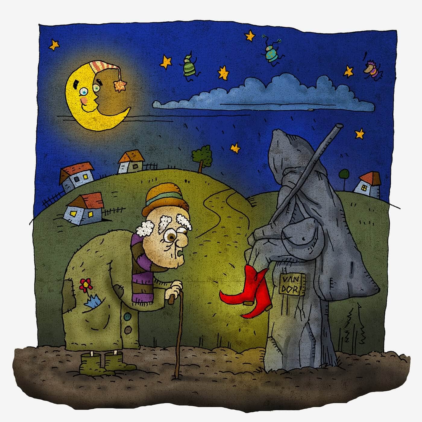 A suszter ébren vár minket… a ruhákat készítgeti a feleségével, vagy eljátssza, hogy hortyog, mert akkor nem kell foglalkoznia velünk… a tanító, szegény… azt beszélik, beleszeretett az özvegyasszonyba, aki a virágfüzéreket fonja… csak nem mer elmenni hozzá… szégyelli, hogy nincs pénze cipőre… a szattyáncsizmát vigyük el hozzá… nem szabad, nem szabad! … fogadjuk el a ruhákat, és, uzsgyi, irány az országút! … országút a fenét, beállunk a falusiakhoz, segítünk nekik…