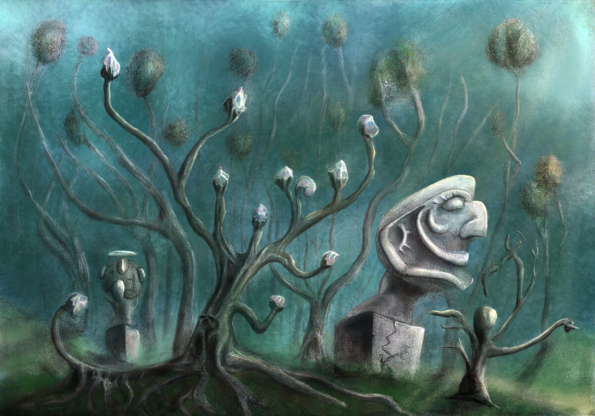 Nincs otthonom. Cél nélkül sétálok a szénfekete erdőben. Megérzek valamit a talpam alatt, egy kis zöld növényt. Megijedek, hogy összetapostam, de nem, semmi baja. A szára ujjnyi vastag, és még egy pici levele is van. Előbb gyengéden meghúzom, aztán erősebben, de nem tudom kitépni a földből.