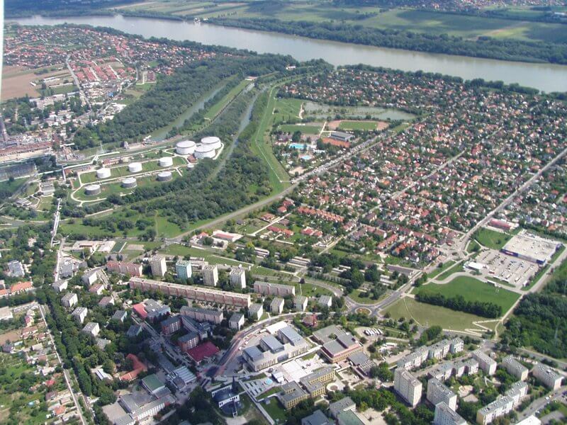 A „két nagy dög” a Kőolajfinomító és a Hőerőmű. Mindkettőt a hatvanas években kezdték építeni. Az eredeti elképzelés az volt, hogy a falu mellett, az Erőmű közelében építenek egy kisebb lakótelepet, ún. készenléti telepet, „ahol éppen csak azok laknak, akik a működtetéséhez a két vállalatnak segítséget tudnak nyújtani a műszakon vagy a munkaidőn kívül”. A hetvenes években azonban „abszolút nem tartották ehhez magukat”, és a két nagyvállalattal azonos mértékben fejlesztették a lakótelepet is. Így keletkezett — csaknem egy évtized alatt — ez a szép szocialista város, ott lenn, „a gödörben”.