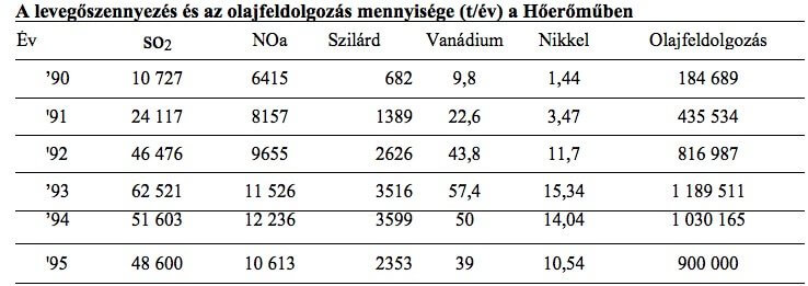Mármost nézzük meg, hogy a városi vezetés hogyan emlékezik azokra a ’92—93—94-es „szennyes” évekre:A táblázatból egyértelműen kiderül számunkra, hogy 1995-ig a szennyezés csak egyetlen módon volt csökkenthető: a nehézfűtőolaj-felhasználás, ergo a termelés csökkentésével.