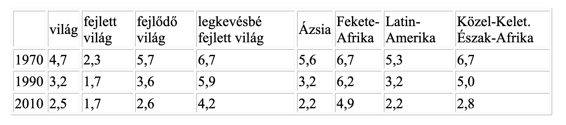 A TTR mutató évezredekig 6 és 7 közti értéket mutatott az egész világon. Ez a gépi termelés térfoglalásával csökkenni kezdett. A táblázat adatai azt mutatják, hogy a világon az elmúlt 40 évben rendkívül gyors és általános TTR zuhanás ment végbe. Emellett az is látszik, hogy az általános zuhanásban a fejlettség függvényében fáziskülönbségek mutatkoznak. Mindenhol esik a TTR, de a fejlettebb országok mutatói ma ott tartanak, ahol bizonyos idő elteltével a kevésbé fejlettek fognak. A demográfusok régen kiszámították, hogy úgy 2020 körül a világ TTR értéke 2,2 alá süllyed. Ebből következően a Föld népessége 2050 körül mintegy 9 milliárd fővel tetőzik, azután abszolút csökkenésbe fordul, ami eléri a ma még jobban szaporodó fejlődő világot is, csak később, mint a világ egészét.