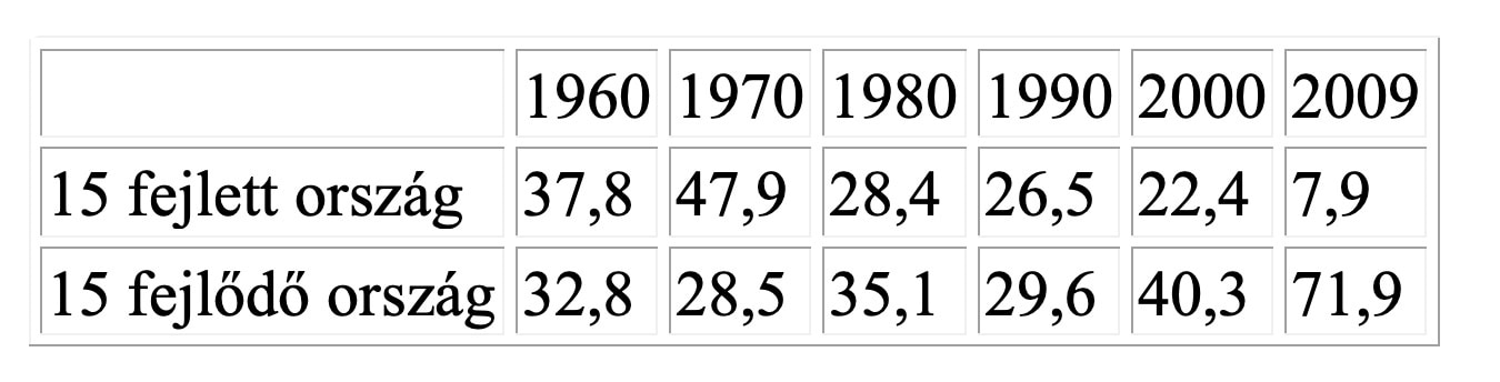 A táblázatban jól különválik a fejlett és a fejlődő országok csoportjának növekedési dinamikája. A mai fejlett világ az ötvenes, hatvanas évekig gyorsabban fejlődött, mint a mai fejlődő. A hetvenes években azonban lassú helycsere indult meg. Később egyre határozottabban szétnyílt a növekedési olló a fejlődők javára. Vagyis megfogalmazható a világ hosszú távú növekedési megatrendje, ami országonként harang alakú görbével írható le. A gépesedés belépésével és térfoglalásával erősen felgyorsul a növekedés, a kiteljesedésével viszont lassulásba fordul Amikor egybefüggő rendszerré válik a gépi termelés, a növekedés nagyon lelassul, szinte leáll. Minden jelenleg lassan növekedő fejlett országban volt egy korábbi növekedési aranykor. A mai szárnyaló, fejlődő gazdaságokra is a növekedés lassulása vár, amikor majd náluk is kiteljesedik a gépi termelés rendszere.