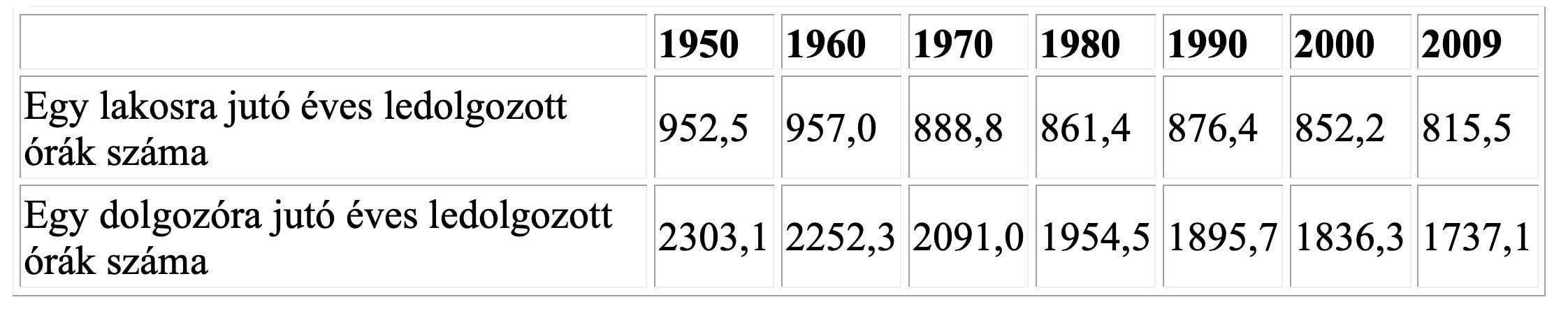 Az adatokból látszik, hogy a fejlett világban a vizsgált 60 évben folyamatosan csökkent a bérmunka terjedelme, vagyis a gazdaság élőmunka szükséglete: egy lakosra vetítve 15%-kal, egy dolgozóra pedig 25%-kal. Gondolkodásunkban ez a munkanélküliség szinte elviselhetetlen rémképét veti fel. El sem tudjuk képzelni, hogy a javakat alapvetően ne a munkarészvétel alapján osszuk el, sőt, feltételezzük, hogy az ember életcélja, morális alapja is csak ez lehet A zsugorodó élőmunka-szükséglet kezelésére a társadalmak a meglévő gondolkodásmódjukon belüli megoldást keresnek, amely mellett megőrizhető a foglalkoztatás, a munkarészvétel alapú elosztás, az évszázadok alatt rögzült morál. Azért csökken jobban az egy dolgozóra jutó munkaidő, mint az élőmunka-szükséglet, hogy többen hozzáférjenek az álláshoz. Napjainkra azonban kimerülni látszik ez a lehetőség. Már ma is számos fejlett országban az egy dolgozóra jutó éves munkaidő 1300–1500 óra, és a dolgozók mintegy felének valamilyen „atipikus”, rövidített munkaideje van. A mai fejlődő országok előtt is ez a perspektíva áll. Erre a legjobb bizonyíték a szemünk előtt játszódott le. A vizsgált hatvan év alatt fejlődőből a világ egyik legfejlettebb gazdaságává vált Japánban korábban hagyományosan sokat dolgoztak Ahogyan azonban kiteljesedett a gépi termelés, lecsökkent az egy dolgozóra jutó munkaidő évi 1700 órára.