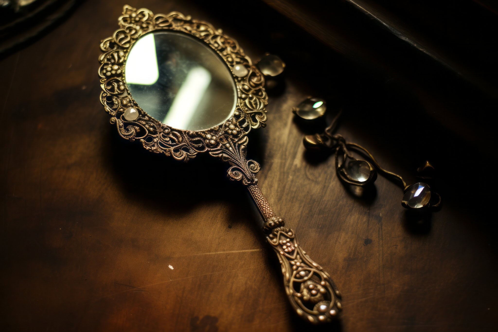Mindjárt a küszöbön átlépve az egyik sarokban szemébe is ötlött az ablaknak fordított nagyalakú tükör, amely épp az őszi eget tükrözte, meg a festőien hámló, félig kihajtott spalettát. A bárónő maga után húzta a férfit, egyenesen arrafelé. Így ő került először a tükör látóterébe: a férfi láthatta, amint a tükör lapján megjelenik a hányavetinek tűnő, valójában gyakorlott mozdulattal ravasz kontyba fogott haj, melynek minden egyes szálába finom ezüsthálót szőtt a beeső napsugár. A feljegyzések helytállónak bizonyultak. A tükör mestermunka volt, a valóságosnál is hívebben adta vissza a bárónő vonásait. Ennek láttán töredék-másodpercnyi rettegés villámlott át az idegenvezető idegrendszerén. Aztán ott álltak, kéz a kézben, a tükör előtt. Képmását megpillantva észlelte csak, milyen komikusan ijedt arcot vág. Rendezte vonásait. A bárónő ezzel mit sem törődött: mosolygott.
