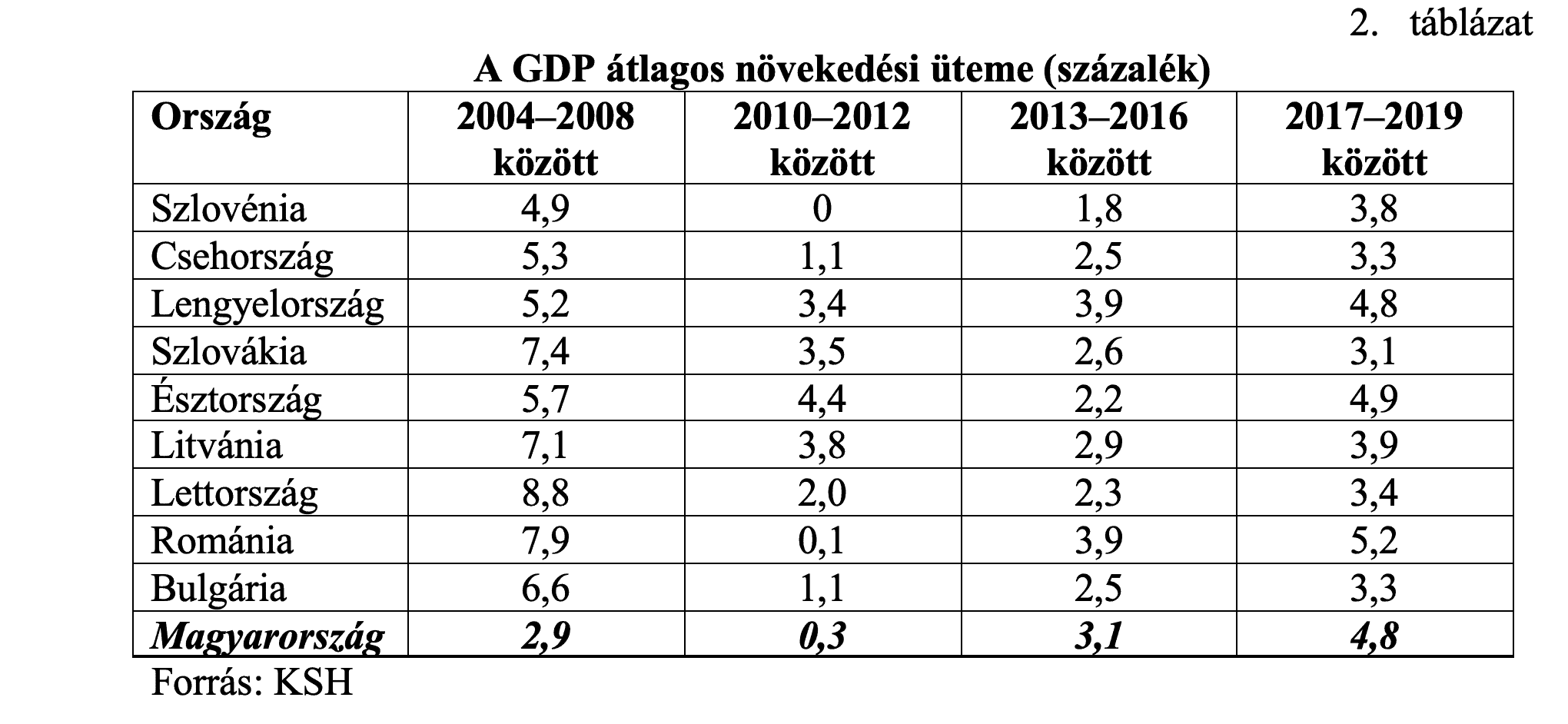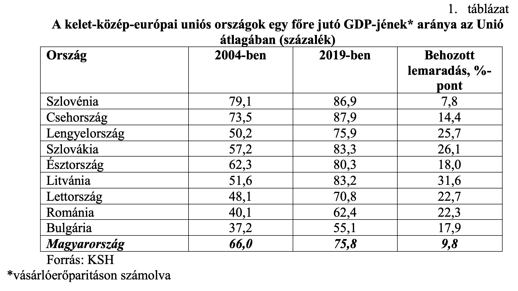 A számok értékelésénél figyelembe kell vennünk, hogy Románia és Bulgária csak 2007-ben lett tagja az Uniónak, ami hátrányt jelentett számukra a 2004-ben csatlakozottakhoz képest, hiszen ők csak a 2014-2020 közötti ciklusban jutottak teljes értékű tagként az uniós forrásokhoz. Ennek ismeretében különösen gyenge a magyar konvergencia. Az Unió átlagához a 2004-es csatlakozáskor Szlovénia és Csehország állt a legközelebb, és ez 2019-re sem változott. Ám míg akkor a táblázatban számba vett országok között a harmadik helyet foglaltuk el, 2019-re visszacsúsztunk a hetedikre.