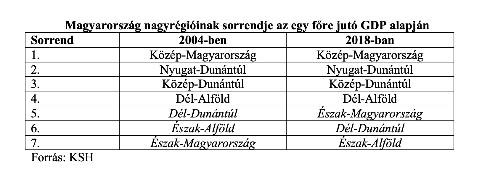 Noha az uniós források elosztásánál az országon belüli regionális különbségek kiegyenlítését kellene követni, az egy főre jutó GDP alapján azt látjuk, hogy 2004–2018 között (2019-es adatok még nem állnak rendelkezésre) semmit nem változott a legjobb teljesítményt felmutatók sorrendje. Csak a „periférián” történt némi átrendeződés: Észak-Magyarország lekörözte Dél-Dunántúlt és Észak-Alföldet.