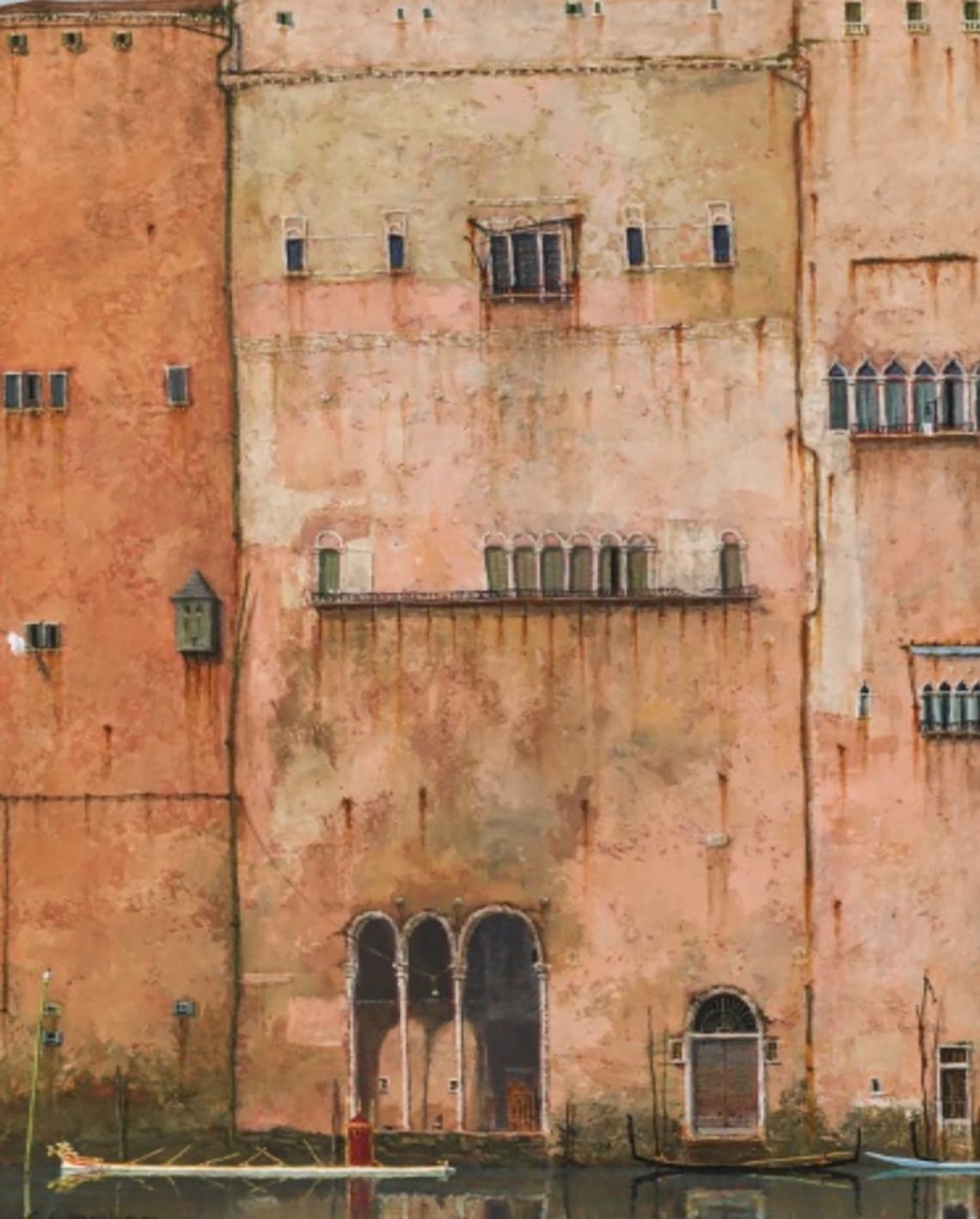 Akárhogy is, a képek főszereplői kétségkívül a falak. Okkersárga, téglavörös, csontfehér, időtől megpróbált falak. Azt olvastam, hogy a festő előbb akrillal vékony festékrétegeket visz fel a táblára, egyiket a másik után, majd ezeket óvatosan csiszolja, míg el nem éri ezt a patinás áttetszőséget. Vagyis azt játssza, hogy ő az idő. A színek megöregedtek ugyan, de, mint az itáliai házak homlokzatán szokás, olyan szépen öregedtek meg, hogy valósággal irigyli őket az ember. Én legalábbis gyakran szeretnék olasz épület lenni: lehetőleg szerényebb római bérpalota vagy tükröket rejtő velencei rezidencia. Ilyen intim kapcsolatot tartani az idővel, ami nem kifakítja a színeket, hanem megérleli – az ilyesmit csakis tőlük lehet megtanulni. Csak azon tűnődöm, hozzá kell-e venni ehhez a zárkózottságot, néptelenséget, nagyvonalú nemtörődömséget, az elfeledettség arisztokratikus légkörét, vagy menne anélkül is?