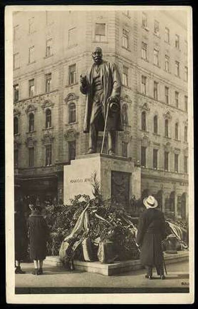 Szobra az Erzsébet körút és a Dohány utca sarkán állt, a háború után döntötték le. Az emlékmű talapzatának oldalán relief, rajta ismét Rákosi Jenő, profilban, szemközt vele az angol hírlapkirály, Rothermere lord. A dombormű első találkozásukat örökítette meg, Rákosi 1926-ban, nyolcvannegyedik esztendejében utazott Angliába, hogy személyesen ismerkedjék meg Rothermere-rel, aki újságjaiban igazságot követelt a megcsonkított Magyarország számára — fullánkos cikkek szerint azzal a távolabbi céllal, hogy fia idővel elfoglalja az üresen álló magyar trónt.