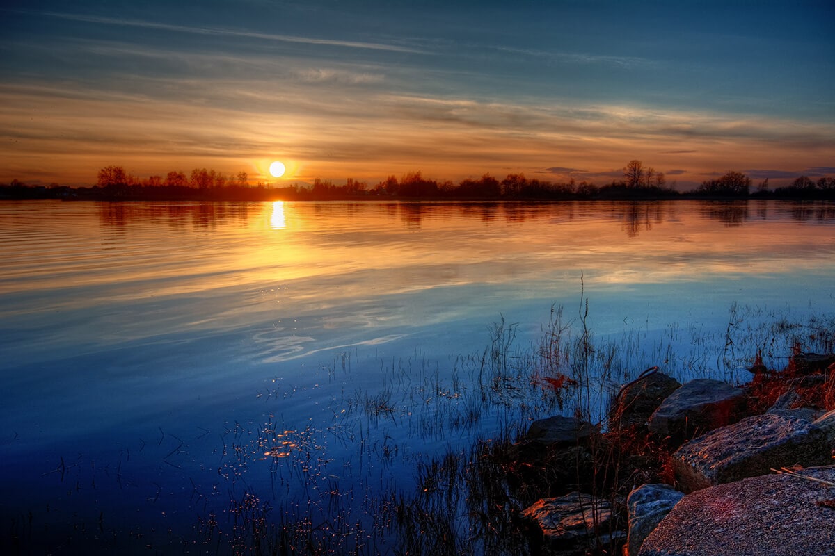 „Minden néma volt, egy pisszenés se hallatszott, mintha az egész világ álomba merült volna; csak néha-néha kuruttyolt valahol egy béka. Először egy fakó vonal látszott a vízen túl, az erdő körvonala a túlsó parton: aztán az ég egy helye megsápadt; aztán a sápadtság terjedni kezdett; a víz is lassan fényt kapott és nem volt már egészen tintafekete, inkább szürkés; apró, sötét pontok jelentkeztek rajta, bárkák és egyebek – és hosszú fekete csíkok: tutajok.”