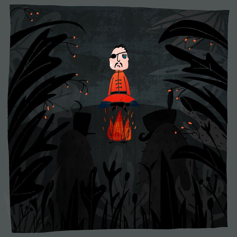 Rózsasándor nem válaszolt, elindult a titkos tisztás felé. Panzasándor a nyomában. A titkos tisztás kellős közepén pisla lángú tűz égett, a tűz mellett sovány alak kuporgott. Ahogy az érkezők felé fordította ábrázatát, Panzasándor nyomban megpillantotta a fél szemét takaró kötést.