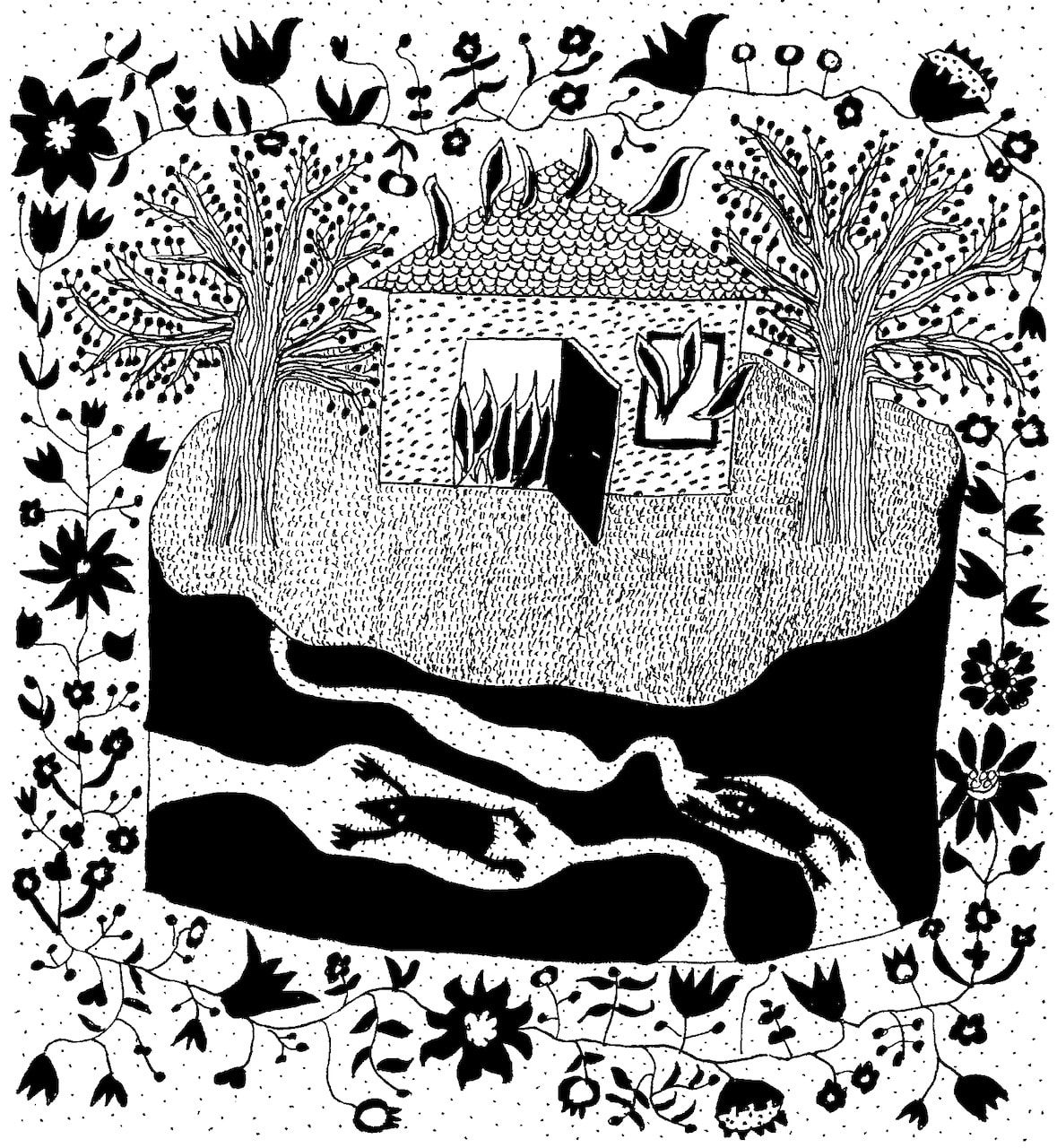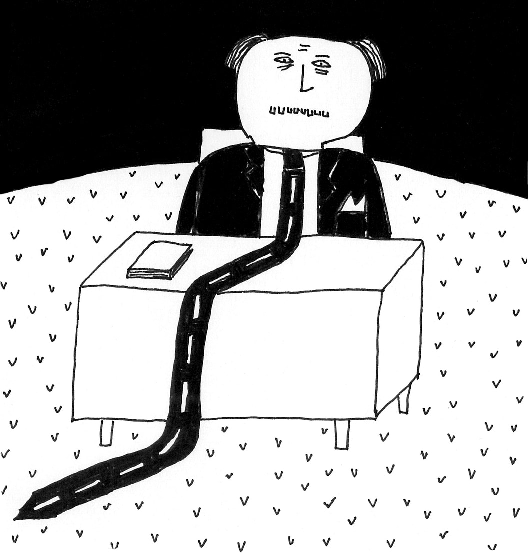 Ha Szentgyörgyi Zsolt lát most[1], bizonyára az általam viselt nyakkendő bosszantja a legjobban: tanácstalan vagy riadt arcú kép-hősei hosszabb vagy rövidebb nyakkendőt viselnek, sőt, egy különösen ellenszenves, vicsorgó alakról három nyakkendő is lóg; háromfejű sárkánynak is beillene, csupán a nyakak és a fejek hiányoznak – egy híján – a nyakkendőkhöz. Rövid nyakkendőben és öltönyben áll a B-fejű, természetesen Bácsi is, akinek épp fejére illő, B-alakú kalapja egy félbemaradt B-t formázó fogason (állványon? bálványon?) lóg, és a Bácsi csak áll, csak áll, mert Szentgyörgyi Zsolt figurái teljesen feloldódnak abban a helyzetben, amiben éppen elkapta őket: csak ezekben az állapotokban tudom szereplőit elképzelni, vagyis – másutt látott képekkel ellentétben – képtelen lennék megmondani, a hősök mit csinálnak majd a következő pillanatban, vagy mit műveltek azelőtt, hogy képbe kerültek. A rajzok ennek ellenére nem mindig statikusak, például vannak éppen repülő madarak, őket azonban egy vénasszony-tekintetű, de hajában masnit viselő nőnemű lény, igazi vén-lány-lény, tartja fogva – vagy tartja fenn egyáltalán – egy-egy madzagon. A madarak repülnek, mégis állnak, mert a madzagok nem feszülnek meg; harmonikában, petyhüdten lógnak. Még a legdinamikusabb a kedvenc képem: itt ház látható két gyümölcsfával, a ház talán ég, de ez sem egyértelmű, mert a táncoló nyelvek közül a tetőn láthatókat nézhetem madaraknak, az ajtóban sorakozókat és az ablakból kinövőket pedig növények hosszú leveleinek. A kert alatti, a felszínnel csak egy ponton érintkező patakban – csatornában – lebegő szőrmókok – elkárhozott lelkek – valószínűleg úsznak, de nem lehet tudni, felfelé-e vagy lefelé. Egyébként tizenhárom (láng)nyelvet számlálok, ahogy egy másik képen – a vezetőt leszámítva – tizenhárom kivont kardú, vicsorgó katona menetel elszántan, viszont, mint láttuk, két gyümölcsfa és két szőrmók van, és ez az utóbbi szimmetria sok rajz sajátja; egy képen belül egy másik személy vagy tárgy ellenpontozza-tagadja, amit az egyik, legtöbbször szó szerint állva állít. Például egy nagyobb termetű, szemét simléder mögé bújtató, azaz szemtelen rendőr vagy katona kézen fogva tart egy neki alig a derekáig érő egyenruhást – bizonyára a jövő rendőrét vagy katonáját –, de már a kicsinek is épp annyi kitüntetése van – szám szerint tizenöt –, mint a nagynak, és amúgy is szakasztott mása magasabb társának. A felnőtt–gyermek viszony itt is felsejlik, mert a rajzok egytől-egyig gyermekrajzokat imitálnak, miközben gyermeket ábrázolnak felnőttként, felnőttet gyermekként, olyan éles ellentétben, mint a képek mindegyikét szigorúan meghatározó világos-sötét kontraszt. Szentgyörgyi Zsolt rajzain minden pőrén, pusztán, feketén-fehéren mutatkozik, azzal a csúfondáros, leleplező indulattal, ahogy egy eredeti gondolkodású és rajzkészségű kamasz látja a világot, legfőképpen a magukat tekintélyesnek-fontosnak tekintő-gondoló felnőtteket, a behemót, nehézkes Intézmény képviselőit. Például amit a nagydarab elefánt benyel, azt ugyanazzal a gesztussal adja ki hátul, tehát: kár a gőzért, azaz a gombócért. Bácsik türelmesen állnak sorban, hogy a „nem szabad fagylaltot nyalni” (egyáltalán: nem szabad nyalni) tábla alatt álló, tőlük alig különböző bácsitól elvegyék ugyanezt a jelet, vagyis a nem-fagylaltot. Tovább lehetne csoportosítani a képeket aszerint, hogy ugyanazon a képen, de a képek között is, mi néz ki ugyanúgy, hasonlóan vagy másképp. Például kitűnően lehet a fogak mentén vizsgálódni: kinek látszanak és kinek nem a fogai, és főként milyen fogai: van Drakula-fog, nyúl-fog, sőt, egy beat-énekesnek kinéző pasas ötszörös fogsorral rendelkezik, egy termetes, a beat-énekeséhez hasonló fogsorú asszony egyszerre mutatja ki és tartja – mint egy pincér – a foga fehérjét, miközben a szájában tizennyolc, a kezében viszont huszonkét foga van. Csakhogy a néni egy nyúl-kacsa ábrához hasonló férfi-fejben van elhelyezve, s így a nyúl-kacsának, illetve a férfi-fejnek, ami nekünk oldalnézetből látszik, egyetlen szempillantás alatt néni-tartotta huszonkét foga lesz. A helyzet tehát a következő: a nyúl-kacsa bácsi bekapta a vicsorgó némbert, aki a bácsi fejében esetleg mosolyog, de akkor annál rosszabb; ugyanakkor a néni pincérként szolgálja ki a nyúl-kacsa bácsit, aki még az evés legalapvetőbb mozzanataiban is a nénire utalt. Ha akarom, akár a patriarchális házasság emblémáját is láthatom a képen. De mást is, mert a képek egyik jó tulajdonsága, hogy kellő teret engednek a nézőnek a nézelődésre és a gondolkodásra; semmit sem erőltetnek rá, azonban elég jelet hagynak magukon ahhoz, hogy az ember ne maradjon áruló nyomok nélkül, azaz ne érezze magát cserbenhagyva.