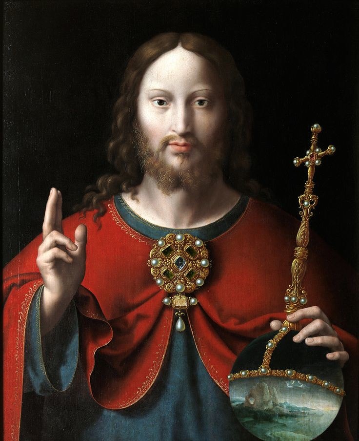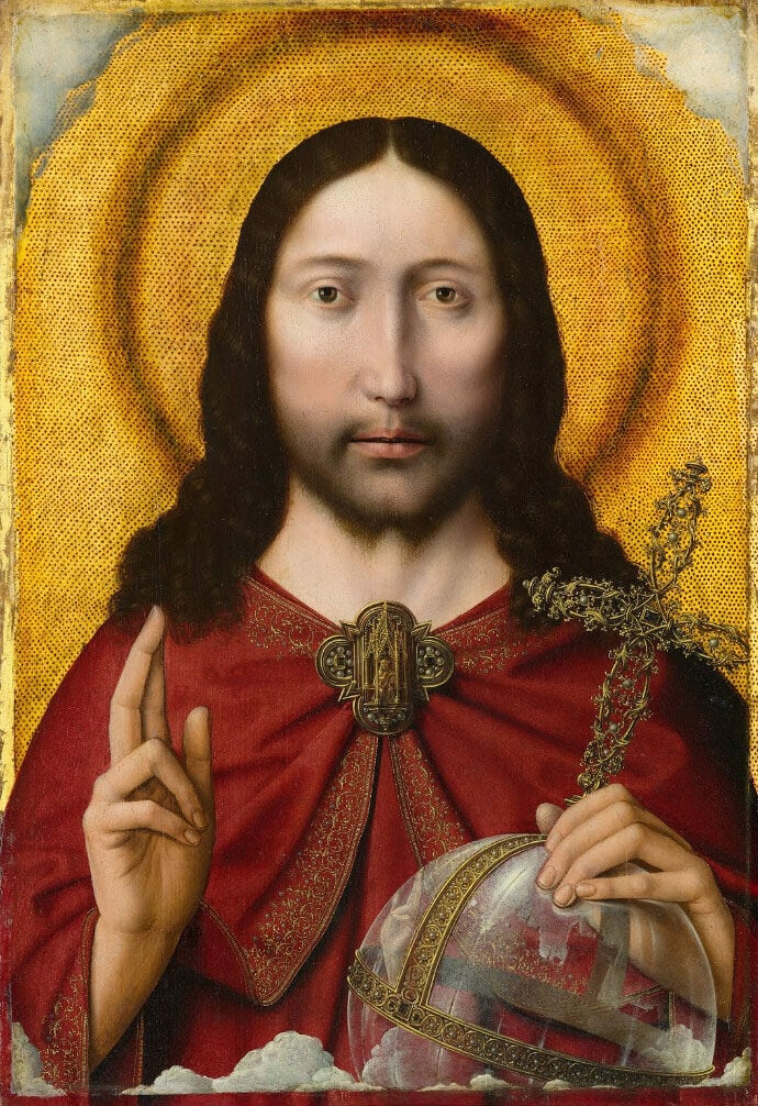 A világgömböt természetesen Isten tartja a kezében a teljes középkoron és reneszánszon át: egészen pontosan a Fiú-Isten, Krisztus, lévén ő az Ige, aki által az egész úgyis teremtetett, tehát feltételezhetően bensőséges kapcsolat fűzi hozzá (a keresztre feszítős intermezzóról most ne essék szó). Legalábbis a nyugati festészetben Krisztus kezében látható a világgömb, szuverén uralkodóként az ő felségterülete a teremtés, míg például a bizánci művészetben ez nem annyira egyértelmű: ott Mihály arkangyal ikonográfiai attribútuma a világgömb, amely merőben más jelentést hordoz, mint nyugaton, és jelzi, hogy a bizánciak kissé máshogyan gondolkodtak a hatalom struktúráiról.