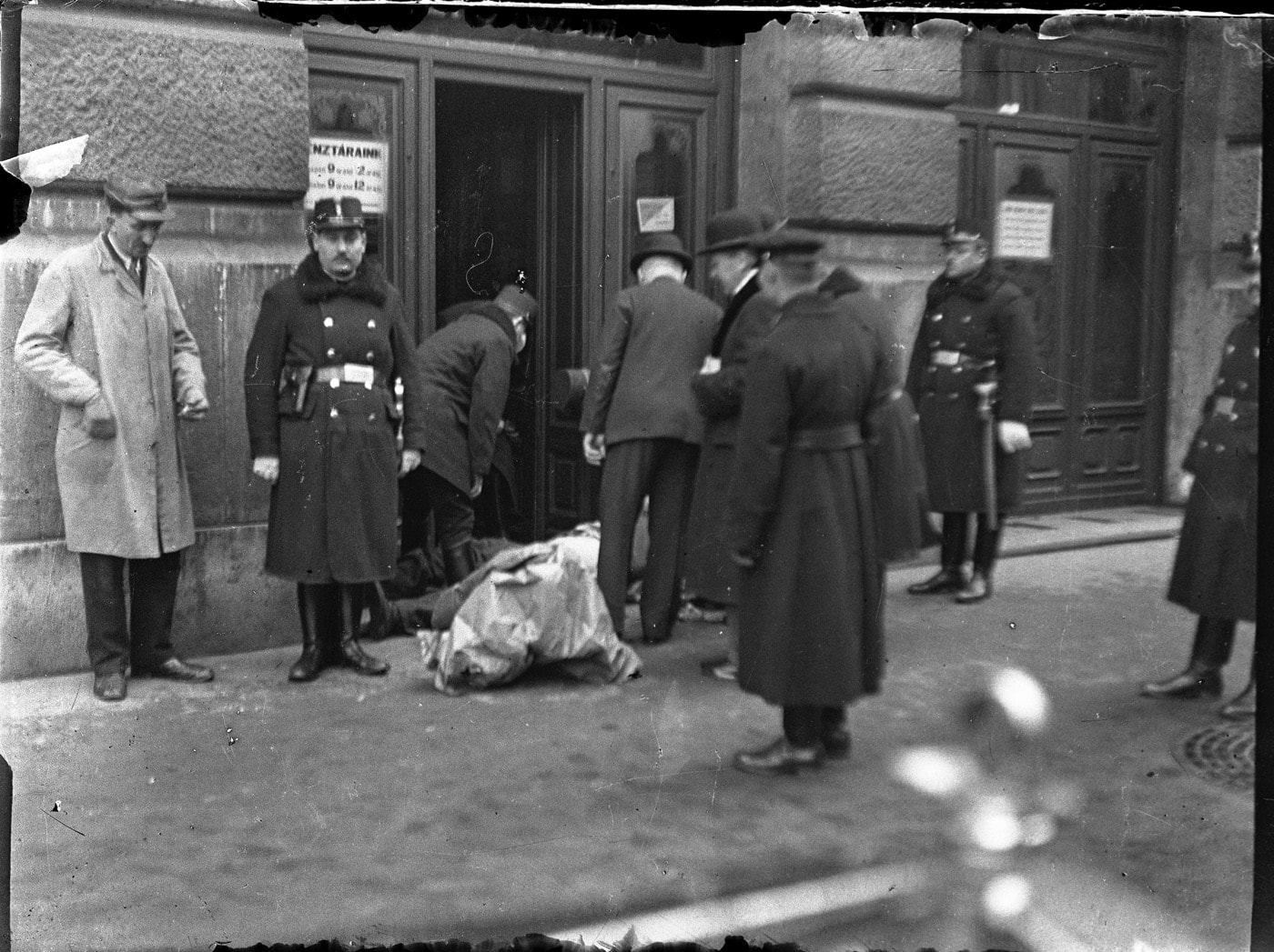 Valaki összeesett és meghalt a váltó-üzlet bejáratánál. Hivatalos emberek érkeznek, kalapban, prémes télikabátban, egyenruhában. Öt rendőr, néhány nyomozó.